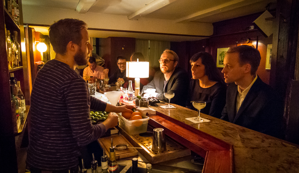 Bartender Mikael Nilsson introducerer deltagerne for aftenens cocktail, Tesla.