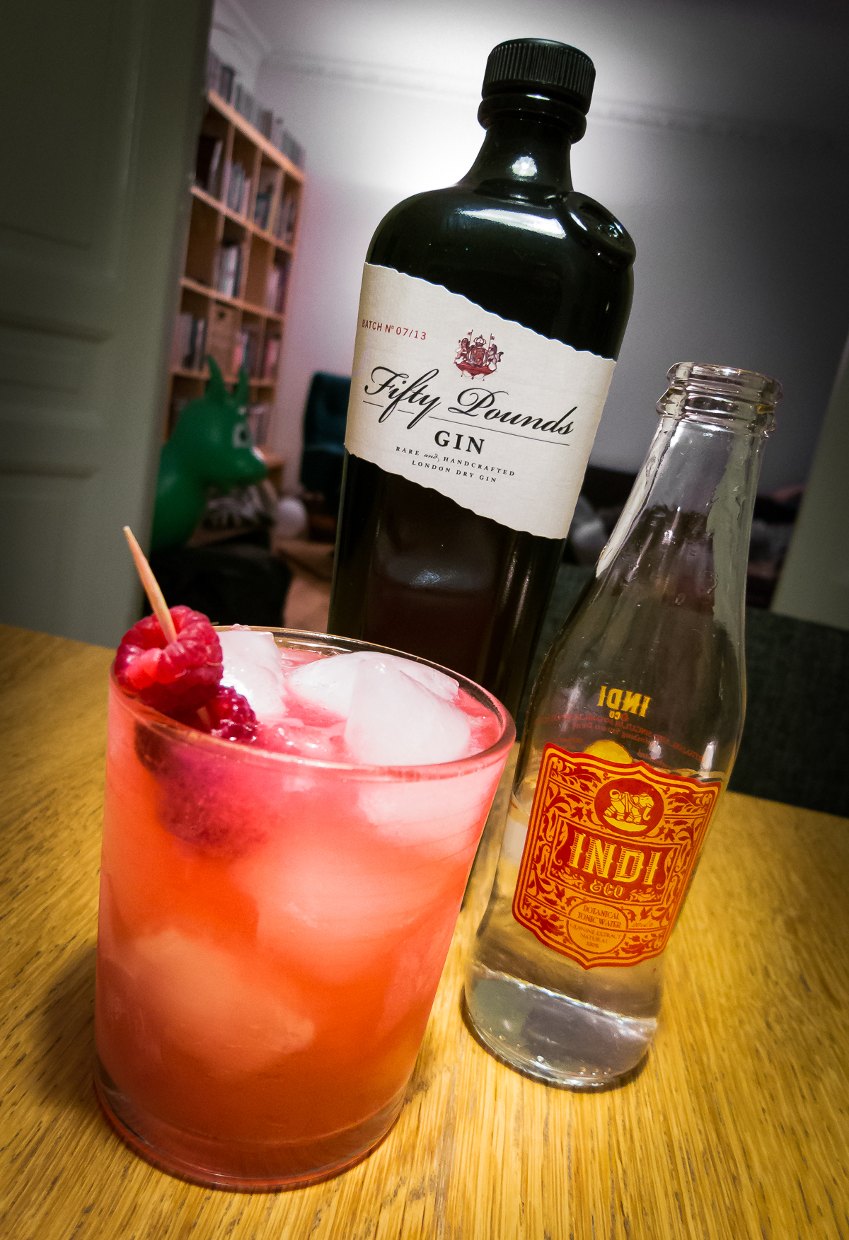 Den glimrende blog Drinkenthusiast.com havde tilbage i april 2013 Fifty Pounds Gin under kærlig behandling. Her introducerede skribenten David Marsland et lille twist på den gode gamle gin og tonic – en Pink Craze, med 60 ml. Fifty Pounds Gin, 150 ml. Fever-Tree Tonic og tre mashed hindbær. Jeg har dog valgt at udskifte Fever-Tree med den lidt mildere, sødere og mere frugtige Indi Tonic.