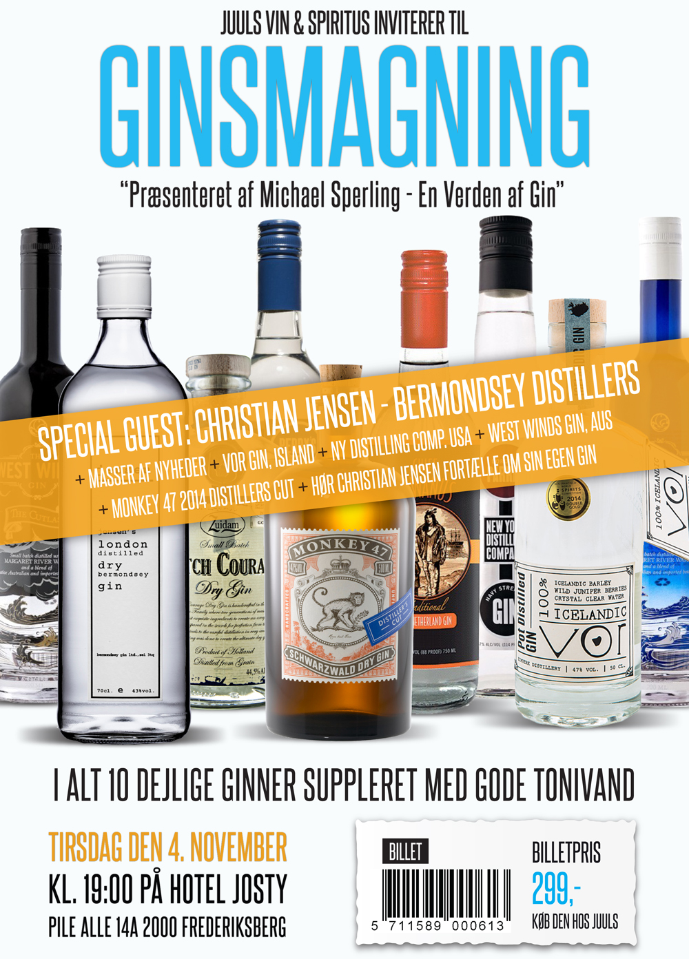 Tirsdag den 4. november 2014 går det atter løs. Sammen med Juuls Vin & Spiritus afholder jeg en stor ginsmagning med hele 10 forskellige gins på programmet.