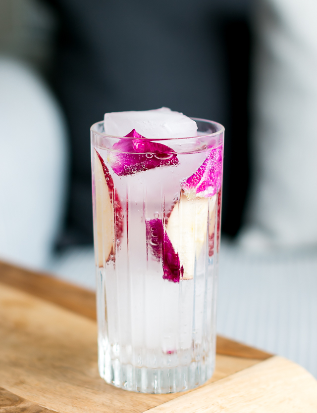 Som en hyldest til de mange frivillige plukkere, der hjælper Anders i hus med årets høst af hybenrosenblade, hæver jeg mit glas med en gin og tonic lavet med Nordisk Gin, den tørre schweiziske Alpe-tonic Gents Swiss Roots Tonic Water, garneret med et friskskåret rødt æble og et par hybenrosenblomsterblade. Chin, chin!