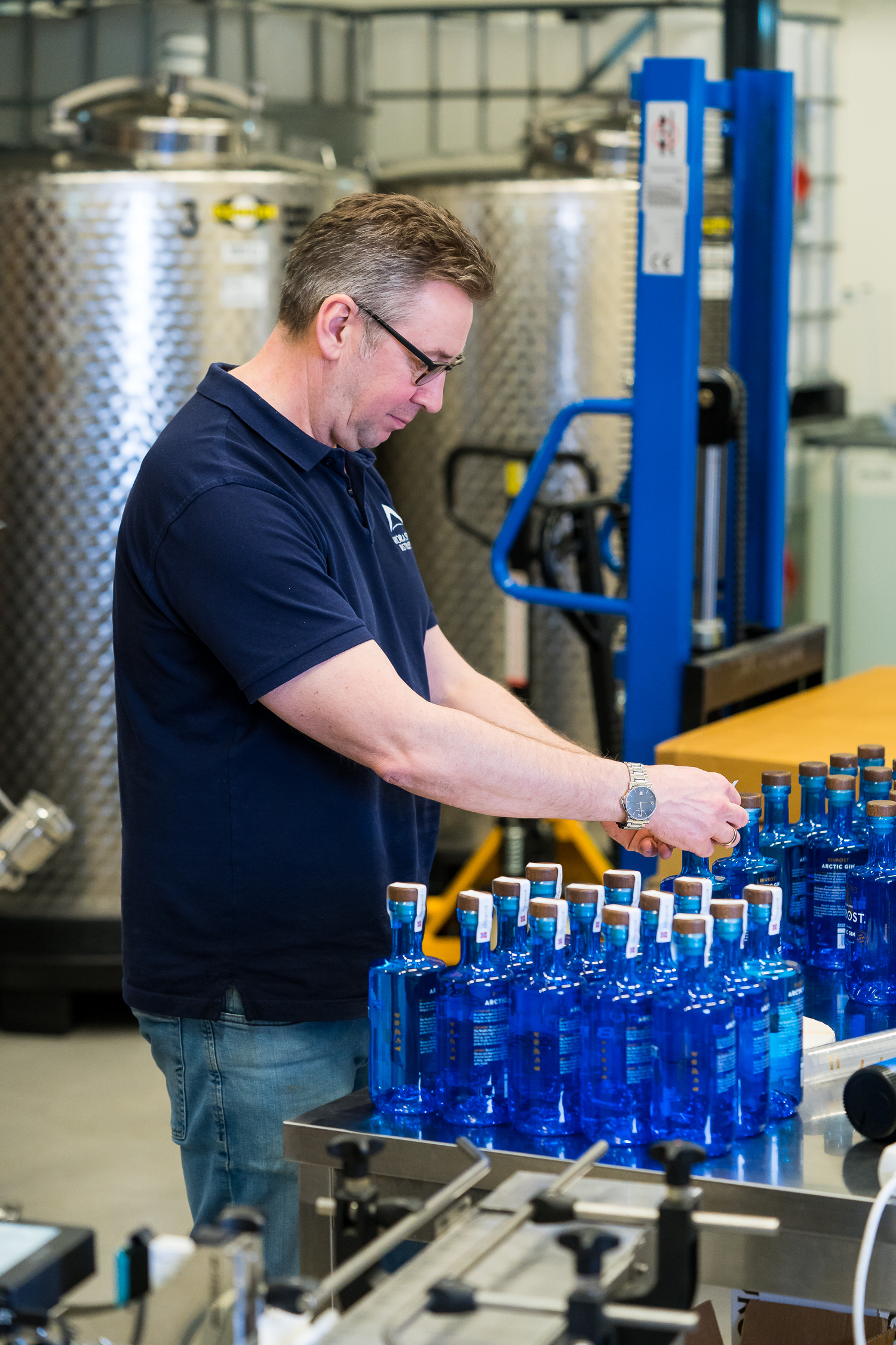 Når selve produktionen af Bivrost Arctic Gin er gennemført i destilleriets 1200-liters kobberdestillator, hviler gindestillatet et par uger i ståltanke, inden det fortyndes med smeltevand fra de nærliggende gletsjere – man er vel i Arktis.